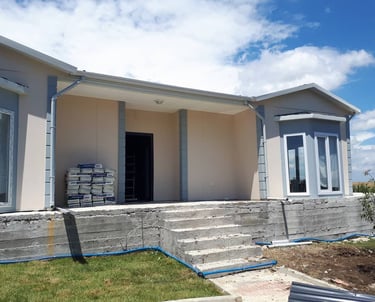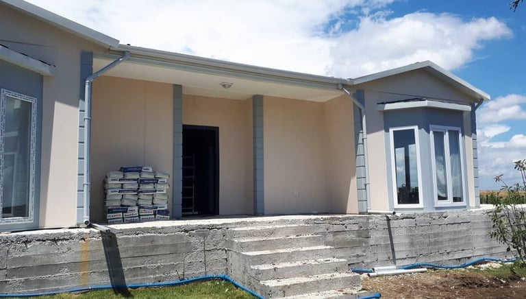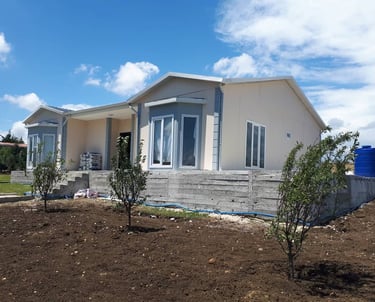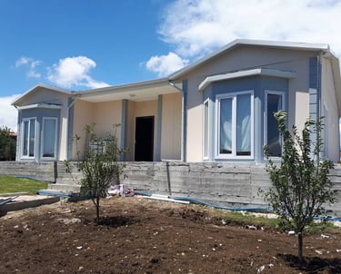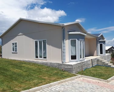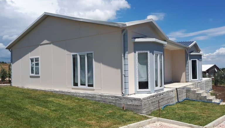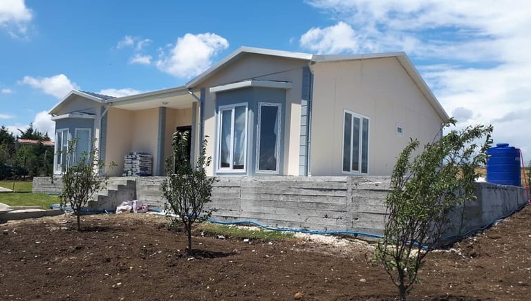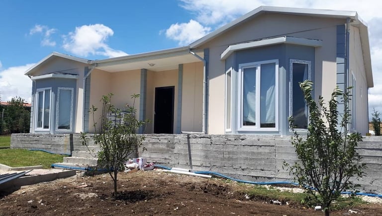 Zemin kat planında geniş bir yaşam alanı, üç adet yatak odası, banyo, hol ve kullanışlı bir veranda yer almaktadır. Fonksiyonel yerleşimi, ferah iç mekanları ve estetik dış görünümüyle hem konforlu hem de şık bir yaşam alanı sunar. Dayanıklı yapısı ve hızlı kurulum avantajıyla, uzun ömürlü ve pratik bir konut çözümüdür.